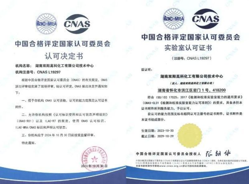 近日,湖南雙陽高科化工有限公司技術(shù)中心成功通過中國合格評定國家認(rèn)可委員會(簡稱CNAS)的嚴(yán)格評審,并獲得CNAS實(shí)驗(yàn)室認(rèn)可證書。這標(biāo)志著雙陽高科在實(shí)驗(yàn)室硬件設(shè)施設(shè)備、檢測技術(shù)能力和管理水平等方面均已達(dá)到權(quán)威認(rèn)可標(biāo)準(zhǔn)。